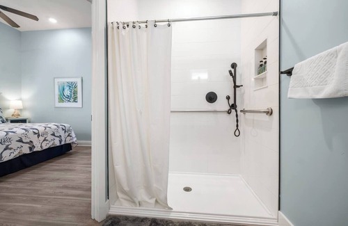 The second bedroom features a stunning private King Suite with en suite roll in shower and grab bars all around (upgrade). This room features extra wide doors (36 in) into the bedroom and bathroom. (ADA Friendly) in case they are needed! A Pack and Play, crib sheet and high chair are kept in the bedroom closet.