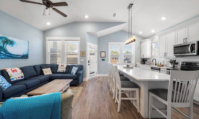 This beautifully decorated beach home has been outfitted to accommodate you, your friends and family for a memorable get away! Whether you bring a dog, grandparents, or a Friend or Family member with differing needs, we have tried to include everything you might need in a 2 Bedroom/2 Bathroom Vacation Oasis! Step into a large open concept Family Room/ Kitchen where you, your family and friends will create memories for years to come. The amazing fully outfitted kitchen features a full suite of stainless steel appliances including a full size side by side refrigerator /freezer, on the door ice maker, dishwasher, disposal, DOUBLE Oven (upgrade), Keurig and drip coffee makers, and an abundance of Shaker Style storage cabinets. You will love the 9 Foot Kitchen Island (with seating for 6) covered in a beautiful Corian surface perfect for eating, working, Zooming or playing games with your Family and Friends.