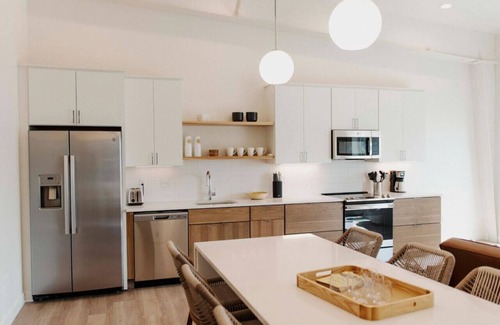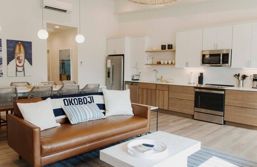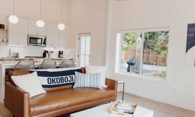 Brand new villas feature expansive ceilings and a comfortable, relaxed summer vibe. Decorated with West Elm furnishings and historic Okoboji photos. Fully equipped kitchen for all your summer needs, a large island for dinners and playing cards. Large smart TVs in each room, soundbar connection, and Wi-Fi throughout. Large living room, dining, and kitchen with new modern appliances. Living room has a leather futon sofa that sleeps two. Two bedrooms, each featuring king size memory foam beds. The second bedroom includes cozy bunk beds. Each bedroom has its own en-suite baths with tiled walk-in showers and white quartz countertops.