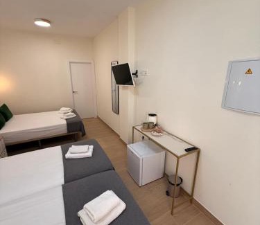 Food & DrinkTea/Coffee makerBathroomBathtub or shower, Hairdryer, Toilet, Private bathroom, Body soap, Towels, Toilet paper, Shampoo, ShowerMedia & TechnologyFlat-screen TV, TVGeneralAir conditioning, Fire extinguisher, Key access, Heating, Tile/Marble floor, Soundproof, Trash cansKitchenRefrigerator, Electric kettleViewCity view, ViewBedroomLinens, Wardrobe or closetAccessibilityUpper floors accessible by stairs onlyRoom AmenitiesSocket near the bed, Hypoallergenic pillow, Clothes rackPhysical distancingSingle-room AC for guest accommodation |