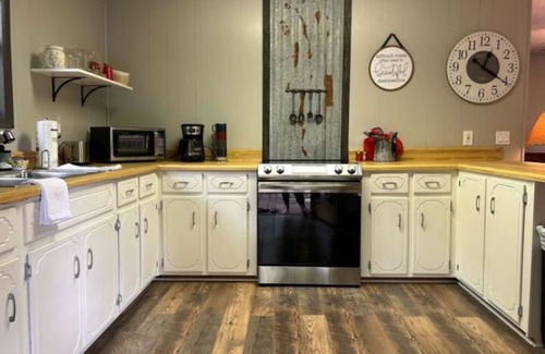 Inside, the cabin’s open-concept living area features a stunning indoor fireplace, which serves as a cozy focal point for gatherings. Curl up on the comfortable sofas with a warm drink, or share stories after a day of hiking and adventure. The fully equipped kitchen is a chef’s delight, complete with modern appliances, ample counter space, and all the essentials needed to prepare delicious meals.