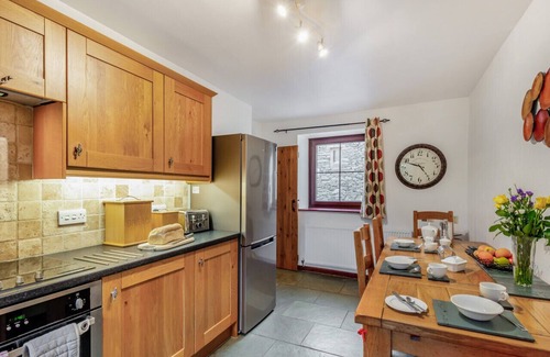 Enter into this delightful cottage. The entrance hallway provides ample room for storing coats, boots, and outdoor gear. The well-equipped kitchen, furnished with oak cabinets, is ready to cater to your culinary needs. The generously sized family dining table serves as an ideal spot to chart the day's adventures over breakfast or unwind with loved ones during dinner. Nestled within the cottage, the snug lounge boasts a comfortable sofa and armchairs arranged around an electric flame effect fire nestled within the fireplace, offering a cosy ambiance for relaxation. Patio doors lead to a gravel patio and a secluded private garden at the rear. Both bedrooms on the first floor offer picturesque views of the garden and the hills beyond. One bedroom features a king-size bed and single bed and the second bedroom features a king-size bed, while the modern bathroom showcases a spacious corner shower cubicle, basin, and WC.