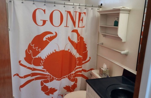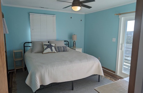 Old Bay Hideaway Cottage has panoramic ocean views with spectacular sunrise and sunset views. Private walkway connects to a shared private beach access to the beach. The upper level great room has a cathedral ceiling with wraparound decking on 3 sides of the home. The wrap around decking provides panoramic views of the ocean, sunrise and sunset. The spa on the top deck provides the best views of the Ocean and Sunset while enjoying a cocktail. The upper level includes Master Bedroom with a King bed. Kitchen, Dining and family room with a fireplace and full bath. The lower level kids family room with 3 bedrooms 2 Queens and 2 twins. Full bath, washer and dryer. Light fixtures with ceiling fans in all bedrooms and living areas. Key-less entry makes contactless checkin easy. Wifi is included. Sheets and towels are provided with the cleaning fee. The cottage is situated on a cul-de-sac with bike and walking trails and access to a private sound front dock for fishing and crabbing.
