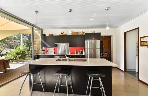 The homestead has a large sunlit living space which includes the kitchen, breakfast bar, dining and lounge. The kitchen is modern and well equipped with a spacious breakfast bar for you to chill out at while someone else cooks. Our guests love opening up the glass bi-folding doors to the deck and entertaining area just outside the kitchen. The deck has beautiful views out over the vineyard, creek flats and mountains of Wollombi. Back inside, the living space includes large comfy lounges, large fireplace and dining table. Modern 4 Burner BBQ on back verandah.