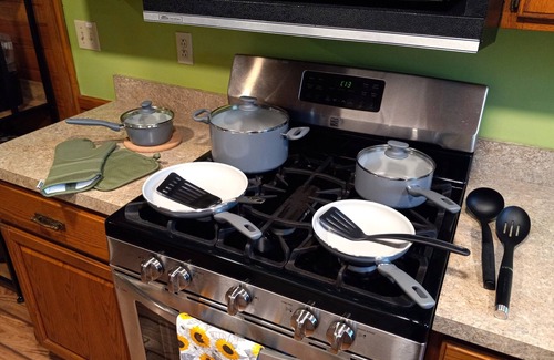 The kitchen is fully stocked with plates, bowls, glasses, and utensils for dining; as well as a variety of pots, pans, cooking utensils and bakeware. Dine at the hand-crafted pub table (seats up to 6) made from a repurposed Jack Daniels whiskey barrel. When you're done, a dishwasher simplifies clean up! Only 6 miles from Super Walmart and Aldi so you can stock up on everything you need to enjoy excellent homemade meals.