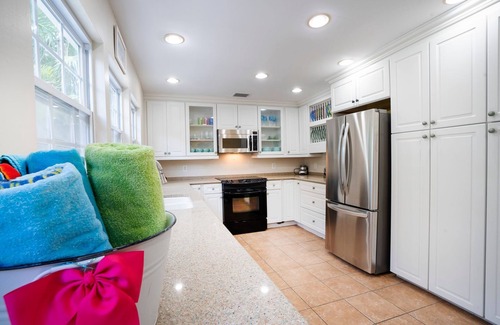 A full-sized, fully equipped kitchen opens directly onto the stunning pool deck—ideal for entertaining. A stackable washer and dryer are included for added convenience.