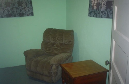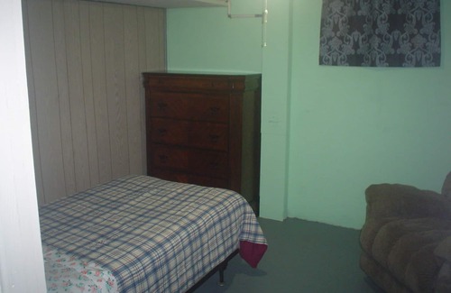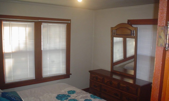 Easy access located center of town. This is a 4 bedroom home, 2 nice bedrooms upstairs with a Queen bed in the Master bedroom and a real nice full size bed in guest room. 2 bedrooms downstairs with 1 nice queen bed and the 4th bedroom downstairs has a twin bed and then a Rollaway for a 5th bed. Living room has reclining couch, super soft big man recliner, 55" flat screen TV with 155 channels of Direct TV . Kitchen is equipped with most needed pots and pans and dishes, microwave, drip coffee pot, etc. Small dining area with 2 bar stools. This is an old house, approximately 75 years old, we have tried to make it appealing but expect some minor deficiencies you could expect in an old house.