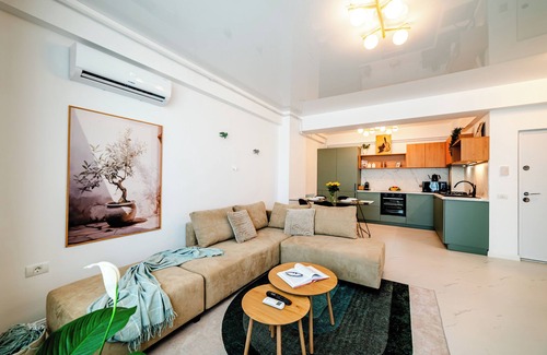 Thoughtfully designed and decorated in soothing shades of olive green and cream, the apartment exudes a calm, airy, and welcoming atmosphere — perfect for a peaceful retreat after a day at the beach.