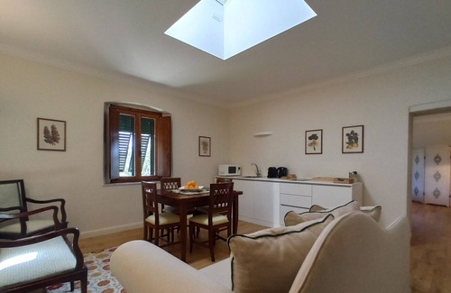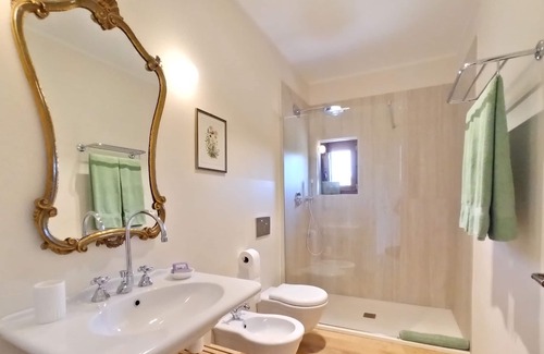 Located on the second floor of the country Villa Santa Giulia, the Gli Olivi apartment, of the Superior type, overlooks the east side of the garden, enjoying a particular view of the surrounding olive hills. The apartment has an independent air conditioning system in the summer and heating in the medium seasons. All windows are equipped with anti-noise and thermal glass and mosquito nets. In the living room there is a kitchen counter equipped with a fridge, dishwasher, induction hob, microwave, electric kettle, coffee machine and toaster. The living area of the living room has a single sofa bed, a satellite TV system and a fast WiFi connection. Upon request, a cot can be added in the bedroom and a high chair in the living room. The bathrooms are equipped with a large shower, bath towels, towels, shower gel, shampoo and hairdryer. The bedroom has a king size double bed, choice of pillows and Egyptian cotton sheets. In the technical room, common to these two apartments, there is a washing machine and a clothesline.