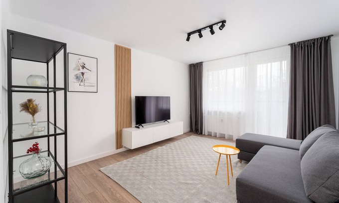 Olsza Stylish Apartment is a practically and comfortably furnished apartment featuring a living room with a fold-out sofa, a bedroom with a comfortable double bed, a kitchen, a bathroom, and a balcony where guests can relax while enjoying their morning coffee or an evening glass of wine. It offers a range of amenities, including free WiFi, a TV, a washing machine, a hairdryer, an iron, a fridge with a freezer, a kettle, an oven, and kitchen accessories.