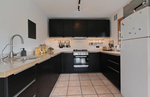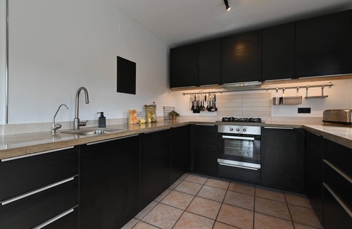 - kitchen with gas hob, electric oven, microwave, dishwasher, refrigerator-freezer, coffee machine, electric kettle, mixer, toaster and juicer