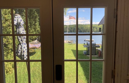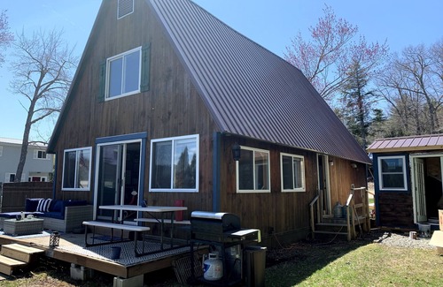 A fun A frame just steps from the lake's edge. The cabin was recently updated and has a cozy UPTA CAMP Maine vibe, but with a lot of modern conveniences like a work space, smart TVs, smart speakers and automatic lighting. Need to bring Grandma? There's a first floor bedroom and a ramp to the door. Wake up in a king bed facing the lake and watch the sun rise or meditate in the hanging hammock chairs. The bunk room can sleep a lot of kiddos, making this the perfect type of house to share with another family. The she shed has a combination exercise/meditation area with equipment and a fully appointed desk ready for remote work. Electric car? We have a Tesla charger!