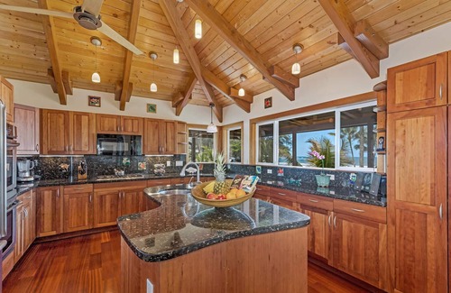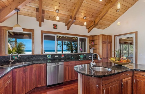 This is the perfect Hanalei vacation rental for your family to enjoy a memorable tropical Kauai vacation. The shops and restaurants in Hanalei town are a short stroll away. For golf lovers only a quick 7-10 minute drive to the Makai Golf Course in Princeville. Pine Tree Villa is centralized along beautiful Hanalei Bay. Here you will discover panoramic turquoise-blue ocean views, beautiful sunrise, magical sunsets, and majestic waterfall mountains. This custom built 2-story oceanfront home offers a spacious 2610 sq. ft. of living space for you to enjoy. Featuring 3 bedrooms, 3 baths, and 1 half bath (powder room). Beautiful Brazilian cherry wood floors, granite counter tops, and marble stone tiles compliment this wonderful vacation home.