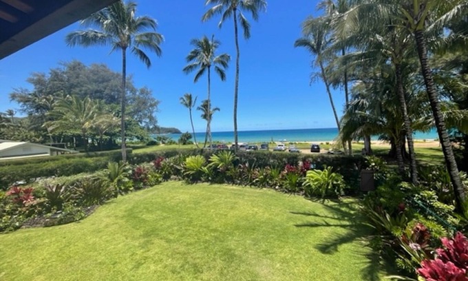 Located along the Pine Trees beach stretch, the heartbeat of Hanalei Bay, this local beach access spot puts you in the middle of everything! This beach access may have cars in front of the house during the day, it's a sandy lot, lined or lit with the number of vehicles dependent on surf -- most all of them leave before sunset. You will also find the tip of Puff the Magic Dragon's famous nose across the beautiful bay to the historic, picturesque Hanalei Pier. Watch whales and world-class surfers from the wrap around lanai all winter, enjoy beautiful sailboats, and sunbathers all summer. People watching is a favorite pastime. Sunsets are magical. Trade winds are pleasant. Rainbows and waterfalls are yours to be experienced. Hanalei is everything that you have read and/or imagined! Hanalei 'town' is only a minutes walk away. This beachfront home is even better in person than the pictures can show. Please be aware that Kauai is experiencing a lot of roadwork right now, and into the future. The Hawaii Department of Transportation is repaving roads, trimming grass and trees along the roadside, repairing the Hanalei Bridge, and more. Expect delays while traveling on our roads, closures, etc. Go to https://hidot.hawaii.gov for the most up to date information.