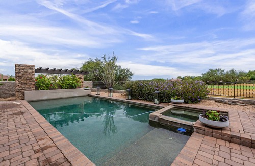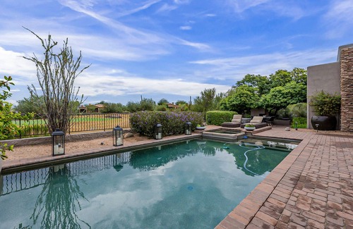 Step into your dreamy desert home-away-from-home where you will spend hours relaxing in the resort-style backyard, enjoying the gorgeous greenery, and taking a dip in the Pool and Soaking Tub (pool heat available for an additional fee). While soaking up a beautiful Scottsdale sunset on the large patio, lounge by the custom built fireplace to keep you warm on our cold desert nights. Or nestle by the fireplace inside one of the three open family rooms. Vaulted ceilings and original art pieces, main family room is perfect for entertaining guest with a mini bar including wine refrigerator and sink. Please inquire for rates and availability as accommodations can be made with dates that may not show available. The open floor plan leads seamlessly to the kitchen and dining area. Newly remodeled kitchen is ready for the ambitious chef! Sit at the granite island with your morning coffee and enjoy a breeze coming in through the open patio doors. Stainless steel appliances complete the spacious fully equipped kitchen. Fix dinner outside on the built-in gas barbecue and eat together in the formal dining room, comfy seating for 8. After dinner, play foosball in the second family room or ping pong in the spacious garage.