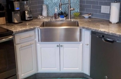 New kitchen cabinets with soft close doors and drawers, stainless apron front sink, granite counter top, and glass tile back splash