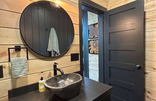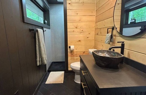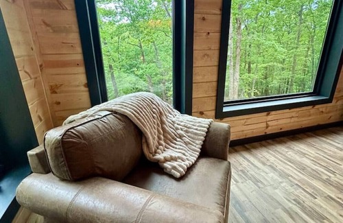 Thoughtfully designed with a sleek, contemporary aesthetic, On the Rocks features private decks where guests can unwind in the soothing hot tub or gather around a fire pit outfitted with four classic Adirondack chairs. Two plush beach towels are provided for your hot tub experience, and a high-top table with chairs is perfectly positioned next to the Blackstone griddle for open-air dining among the treetops.