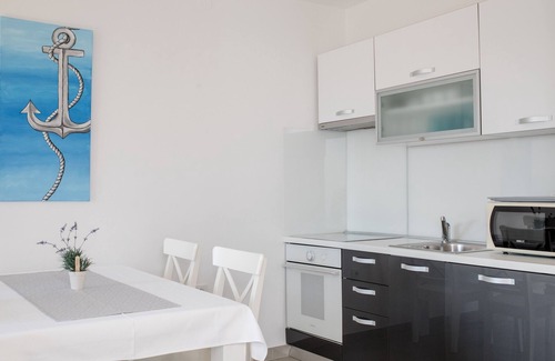 Apartment can accommodate 4 guests. Beds are situated in 1 sleeping rooms, but also in the living room, within 27m2. Guests can use a private balcony to enjoy the warm summer evenings. The apartment offers the sea view. Food can be prepared using barbecue which is shared with other guests too.