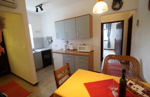 Apartment can accommodate 3 guests. Beds are situated in 1 sleeping rooms, but also in the living room, within 51m2. Guests can use a private terrace to enjoy the warm summer evenings. The apartment offers the sea view. Food can be prepared using barbecue which is shared with other guests too. Shared pool is on disposal during stay. This accommodation unit welcomes pets at an additional charge.