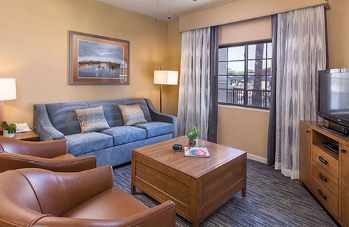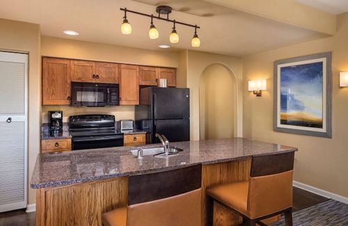 This spacious one-bedroom resort suite is approximately 827 square feet. You'll enjoy a king bed in the master bedroom and a queen sleeper sofa in the living room. Additional amenities include a fully equipped kitchen and dining area, washer/dryer, whirlpool tub and a balcony or patio. Maximum occupancy is four.