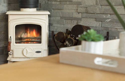 Lounge/Dining area: Log burner, corner sofa, coffee table, smart TV, Dining table with four chairs