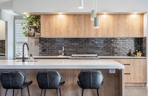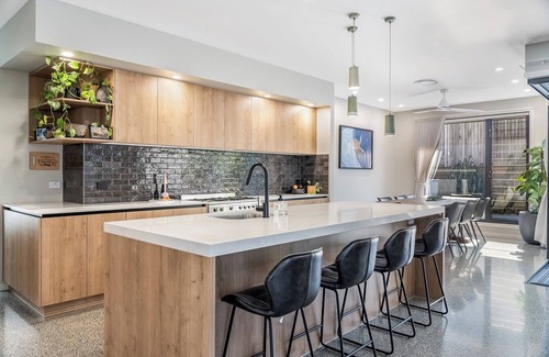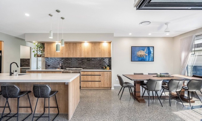 Set across two thoughtfully designed levels, One Palm comfortably sleeps up to eight guests. Downstairs, the open-plan living, dining, and kitchen area is light-filled and welcoming, flowing seamlessly to a private outdoor alfresco space—perfect for lazy breakfasts or long summer dinners. The fully equipped kitchen features stone benchtops, premium appliances, and a walk-in butler’s pantry, making holiday cooking and entertaining a breeze. A separate media room offers a cosy spot for movie nights, and a powder room and full laundry complete the ground floor.