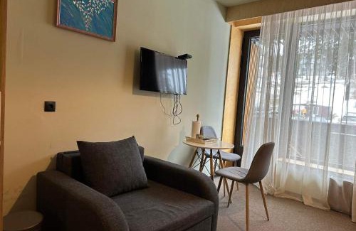 Providing a garden, One Room Apartment in Rooms Hotel Kokhta, Bakuriani provides accommodations in Bakuriani. This apartment offers free private parking and free Wifi. Guests can use a bar. Offering a balcony, this apartment also has a flat-screen TV, a fully equipped kitchenette, and 1 bathroom with a shower and a hair dryer. The accommodation is non-smoking.