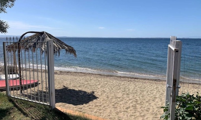 This holiday home is located in Gerakini, Halkidiki and offers you a quiet and comfortable stay, literally one step from the sea. It consists of two bedrooms, a bathroom, a kitchen with a dining room and a living room. Outside there is a private green garden which leads directly to the sandy beach. It is fully equipped and renovated. Ideal for families and groups of friends.
