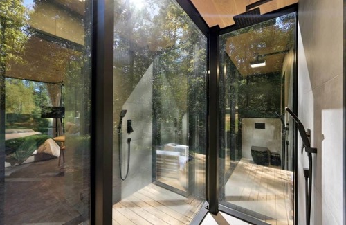 Scandinavian sauna, with forest-facing floor to ceiling glass wall and electric Harvia stove, is located on the deck adjacent to the cabin. It's available year round, with complimentary use of the $35k sauna included in your booking, and exclusively private to cabin guests.