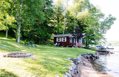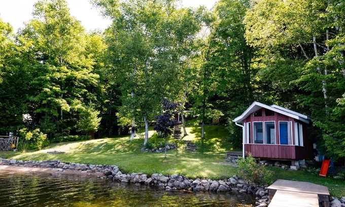 The front of the cottage features a stone patio with a BBQ, dining table and chairs, and a small picnic bench for the kids. There is a slight incline to the shoreline with a great beach for the kids. Ingress and egress to the lake are gradual (no weeds anywhere:). The shoreline consists of a rock/sand mixture. Water shoes are recommended. Swimming from the dock equipped with a swim ladder is a wonderful option and it’s deep enough for awesome cannonballs. The dock will accommodate large watercraft and sea doos. There are two kids' kayaks and a lily pad for hours of fun on the water. A fire pit is located at the water’s edge for those popular evening marshmallow roasts. Don’t forget to stop and stargaze in the night sky!