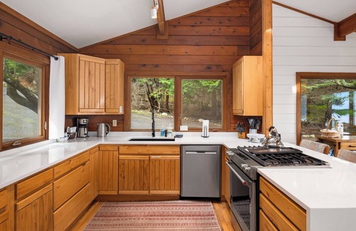 Back at the house, the waterfront hot tub, open kitchen and expansive deck ensure a relaxing getaway in every way possible. Inside, in addition to the first floor living room, this home provides two downstairs bedrooms, one with outside direct deck access and a comfortable queen size bed. The other room has a bunk bed arrangement with a full bed on the bottom and twin on top. These bedrooms share a downstairs bathroom that also serves as the guest bathroom.