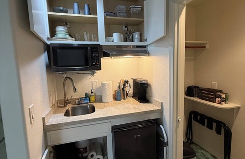- As you walk in, you will find a desk and working space on your right hand side with a lamp and a mirror, to your left you’ll find a fully loaded kitchenette with a hot plate located under the sink. Also, under the sink, you will find a dish rack for clean dishes, paper, towels, and trash bags. There will be a fresh sponge and dish soap and a dish towel for your use as well. All of the dishes and cooking ware will be above the sink area in the cupboards and a Keurig coffee maker will be on the counter.