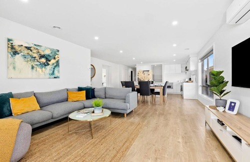 Welcome to our happy place, perfect for creating fun, laughter, and lasting memories with family and friends. This newly built single-level home sleeps 9, featuring 4 bedrooms (very comfy mattresses), 2.5 bathrooms, stylish new furniture, & indoor/outdoor dining options. Enjoy free Wi-Fi, NETFLIX, & a great selection of board games. Centrally located & only a short drive to Geelong, Torquay, & Barwon Heads attractions. Kids will love the large playground just 100m away, keeping them entertained.