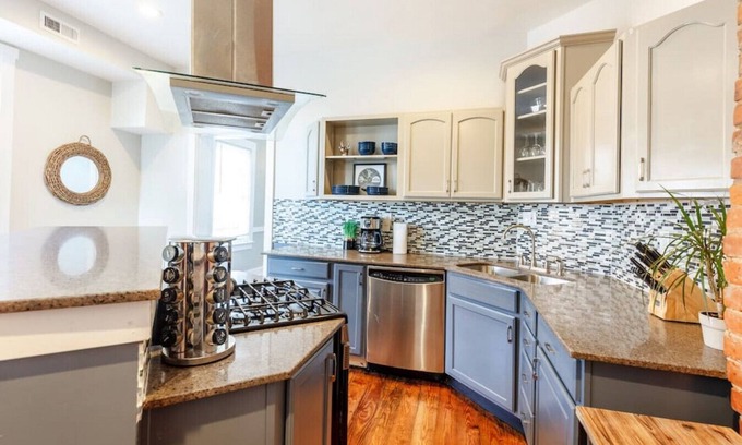 Though built in 1860, the building has since been transformed into a modern home. You'll have the comfort of central AC and heat, plush beds, and free wifi. Perfect for medium or small groups, the apartment features a queen bed, a full bed, a queen size double-high air mattress and an incredibly comfortable sofa. For groups comfortable sharing beds, the apartment can sleep up to 7.