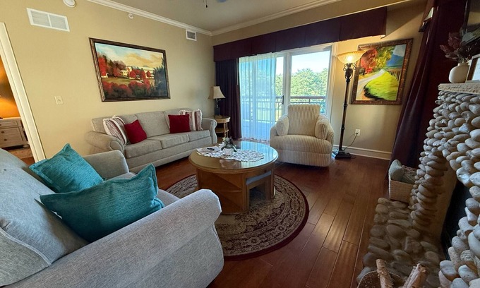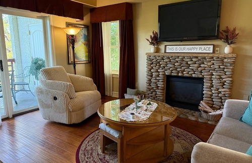 Our beautiful condo is a spacious end unit and is filled with a designer interior featuring granite counter tops, crown molding, stainless steel appliances, gas fireplace, beautiful hardwood floors, large walk-in closets, and high speed internet access. The bedrooms are very private with one located at the front of the condo and the primary bedroom located at the opposite end of the condo with access to the balcony. Both bedrooms feature flat screen televisions and very comfortable king size beds that are sure to provide a peaceful night's sleep. The primary bath features a six foot Jacuzzi tub, large walk-in shower, and a beautiful granite vanity. The Living Room features a 50 inch flat screen TV with a sofa that makes a queen size bed for those needing the extra sleeping space.