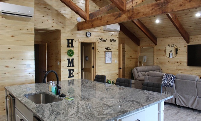 The Owner's Stone Cabin sits high above the Soda Lake Wildlife Management Area at God's Country Resort offering a spectacular view over the thousands of acres of Wildlife Management Area, featuring two bedrooms, two baths in this ultra modern cabin while still offering that family cabin feel. The full granite kitchen with a huge island bar offers the ultimate in family entertainment while watching television. The master bedroom offers a King bed while the second bedroom has 3 sets of built-in bunk beds with plush pillow top mattresses for everyone to enjoy. Enjoy cooking on the back deck or dipping in the hot tub after a long day hiking the WMA or a day in town. God's Country is only about 15 minutes from the Downtown Casinos and the Louisiana Boardwalk. All registered guests at God's Country will enjoy the amenities offered at the God's Country Resort in both the West Campground as well as the East Campground including the two disc golf courses, two jumping pillows, pool in the West Campground, playgrounds, etc. God's Country also offers golf cart rentals, Giant Duck & Swan Paddle Boat rentals, Peddle Cart Rentals, and much more! Any visitors will be required to register and get a day pass, and sign liability waivers.
