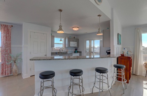 Our beautifully constructed, recently built 4 bedroom home is located in a quiet cul-de-sac steps away from the community amenities and miles away from the stresses of your daily life. Beds will also be freshly made for your arrival, & bathrooms set up with bath & beach towels for your use during your getaway. We have spacious decks wrapping around both the front and pool sides of the home on each level to maximize your views. The ground floor offers dry entry or head up the front steps to enter the home on the mid-level. Each of our 4 bedrooms has its own private full bath, roomy closets, and a Roku TV. Start at the top with this reverse floor plan and you will find our fully stocked kitchen, screened porch, dining area, living area, half bath, queen bedroom suite with private full bath, and deck access at every turn. The dining area offers seating for 8 at the table plus 4 at the island. Our kitchen is fully stocked for the chef in your group with sliders leading to the screened in porch. Included are dishes, cookware, cutlery, barware, & glassware for your every culinary need. Appliances include a blender, standard coffee maker, Keurig, microwave, dishwasher, electric range & oven, & refrigerator/freezer. The living area is airy and bright, with 2 more sets of sliders that lead to deck. The Queen bedroom suite on this level has a full bathroom with a beautiful walk-in tiled shower.