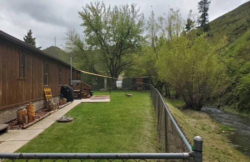 Our 3 br/2ba one level home is on Strawberry Creek, with a fully fenced yard. Set back on US Hwy 385, this location cannot be beat! A rarity in Deadwood, we have ample parking for your truck/trailer if you're hauling UTV's, bikes or something for a car show! Our home is not a palace, but it is really comfortable, clean, with room to relax, a safe yard for kids and pets, and is only a two block walk from the last Deadwood Trolly stop at Deadwood Outdoor Rentals. Half that distance is the legendary Michelson Trail. Comfortably furnished with a king bed in the master with on-suite bath and a walk-in closet. There is also desk to work quietly. Across the house, the queen bedroom and full bedroom share a bath. We have a fully outfitted kitchen and laundry room to make yourself at home. In the backyard, you can sit under the sail canopy at the picnic table or pull up folding chairs to enjoy the babbling creek or watching the mountain for the deer that frequent the area. Whether you are visiting or working in Deadwood or the Black Hills, our home is an excellent place to stay. Longer term rentals are available.