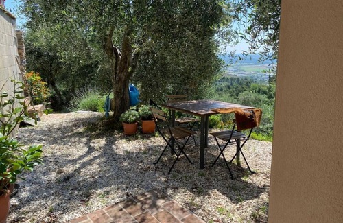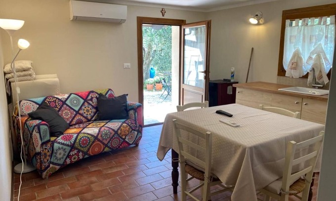 Prenditi una pausa e rigenerati in questa oasi di pace. Alloggio immerso nel verde di una oliveta, paesaggio con vista sulle vicine località, natura e animali da compagnia fanno parte del nostro vivere quotidiano. Il nostro alloggio è all'interno di una proprietà su più livelli dove noi abitiamo, immerso nel verde di una oliveta con 250 ulivi e alcuni alberi da frutto. Insieme a noi vivono i nostri animali da compagnia, cani e gatti in libertà ma anche animali da cortile galline, papere ed oche. Tutto intorno abbiamo la natura che ci osserva. Nel nostro alloggio troverete una camera con 3 letti uno matrimoniale e uno singolo e una culla, un letto aggiuntivo su richiesta , un bagno molto comodo con una bella doccia grande e una cucina attrezzata. Televisore, armadio, condizionatore, riscaldamento, zanzariere alle finestre, tende, biancheria per la camera e il bagno, ingresso indipendente con spazio esterno con tavolo e sedie, accesso alla piscina.