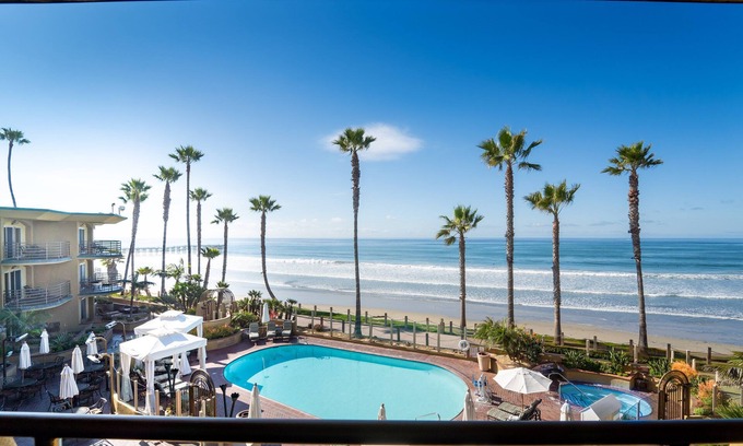 On beach with outdoor pool for sandy fun near Crystal Pier