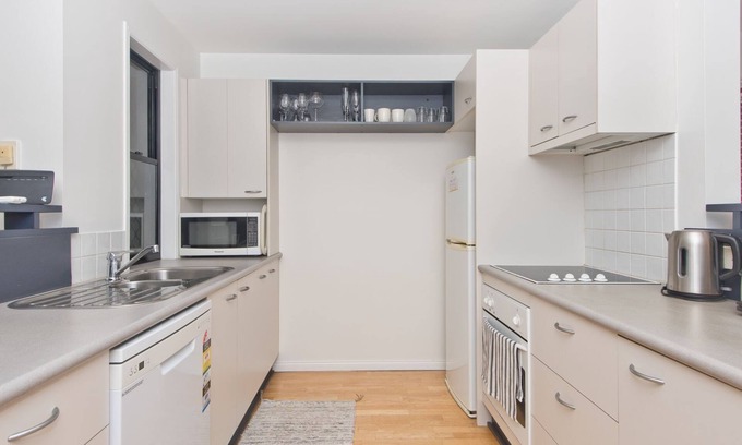 Downstairs the kitchen is fully equipped for cooking meals, it has a dishwasher and microwave to make short or long term stays comfortable and convenient. The grassed courtyard is perfect for children to have some outside time and has a Weber BBQ.