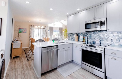 The kitchen is fully equipped with everything you need to prepare delicious meals, including stainless steel appliances and a breakfast bar that seats three. The adjacent dining area features a large table that seats six, perfect for enjoying family meals or entertaining guests.