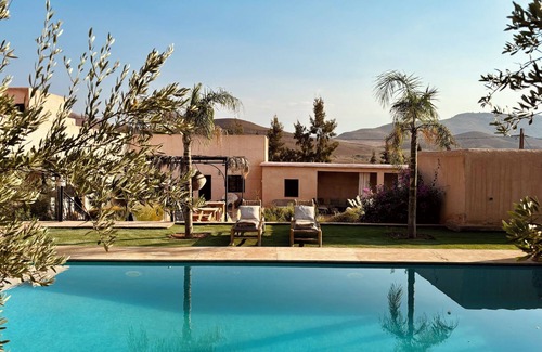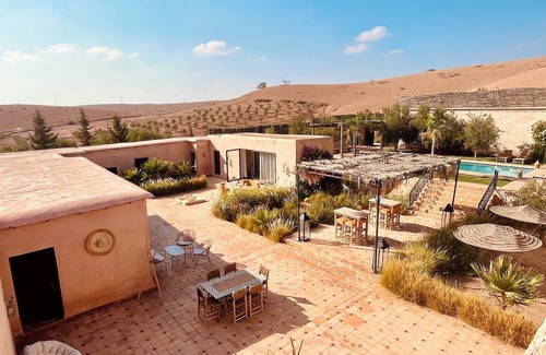 About 45 minutes from Marrakech, this magnificent palace is a true haven of peace with a breathtaking view of the desert. Built like a hacienda surrounded by a large courtyard with a large swimming pool with deckchairs to enjoy the mild climate and the Moroccan sun. Can accommodate up to 10 people with its 5 beautiful bedrooms with large double beds, and 5 beautiful bathrooms are available.