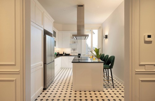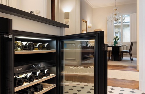 The kitchen, equipped with the latest amenities, offers a 4-door refrigerator with water dispenser and ice maker, dual cook oven, wine fridge, dryer, washing machine, dishwasher, Nespresso coffee machine with milk foam maker, kettle, and an elegant top made of black marble Granito Assoluto. Please take special care of the kitchen's surfaces, avoiding the spillage of acidic substances such as vinegar, tomato, lemon, and wine. The kitchen opens onto a balcony with views of Piazza della Libertà and the hills of Fiesole.
