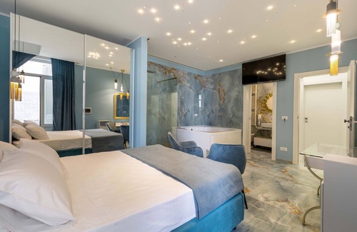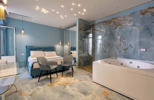Suite Acquamarina is an elegant double room with Jacuzzi whirlpool tub and exposed chromotherapy shower, for vacation rental in Gallipoli for up to 2 people.