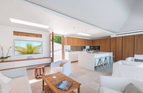 Welcome to Villa Palm, a contemporary 2-bedroom villa in Grand Cul de Sac, St Barts. Private, quiet, and secluded, this laid-back property is just a short distance from the hotels and restaurants on Grand cul de Sac beach. The interiors of Villa Palm are modern and chic, with a minimalist style encouraging you to unwind. The white walls are contrasted with rustic wooden accents, creating a dreamy, island vibe. A clean design features stylish vaulted ceilings, skylights, and warm, recessed lighting above. Nestled in the hills above the bay, Villa Palm is both secluded and within a short distance of shops, restaurants, and Grand Cul de Sac Beach. Tucked away at the end of a little road, Villa Palm enjoys partial ocean views framed by stone walls and lush, tropical foliage. Living Spaces: At the center of Palm Villa is the open-plan great room, home to the modish living room and kitchen. The entire wall at the far end opens to the outdoor terrace, letting in the salty ocean breeze. Greys, whites, and dappled natural sunlight all enhance the striking and modern design. Scattered around the room are several soft white sofas, offering plenty of space to sink in and relax. Whether you’re enjoying a morning coffee or settling in with a good book for the day, this is the spot. A large wall-mounted TV also lets you host cozy movie nights inside. Kitchen and Dining Room: Sharing the space with the living room is Villa Palm’s gourmet kitchen. Cabinetry clad in tropical wood will inspire you to experiment with local flavors and ingredients while cooking. Our concierge can organize grocery pre-stocking or delivery, catered meals, or arrange private chef service for a special occasion. The large center island with bar-style seating is a nice spot for a morning espresso or a casual lunch. More formal meals are best hosted at the outdoor dining table, underneath a gazebo outside in the fresh air. Bedrooms: The 2 bedrooms at Villa Palm are on either side of the living room, ensuring quiet and privacy for both. Each bedroom has a European king-size bed, a dressing room, and an ensuite bathroom with a shower and a partial ocean view. The bedrooms also both have direct access to the outdoor terrace, letting you wake up and start your day with a quick dip in the pool. The minimalist rooms are bathed in creamy neutral colors and natural light, continuing with the luxurious and relaxing vibe. Outdoor Features: Stepping outside onto the terrace makes it feel as if you’re staying in a private retreat. Shrouded with swaying palms and tropical foliage, the only sounds you’ll hear are the breeze rustling through the trees and the soft sounds of the waves in the distance. Loungers and chairs are scattered across the terrace, offering plenty of space to relax in the glorious weather. The inviting pool has an infinity edge, stretching out towards the trees below. Beyond, you can glimpse the curving bay of Grand Cul de Sac and the shimmering Caribbean sea. For those travelers craving a day on the sand, the beach at Grand Cul de Sac is a 5-minute walk. Lining the water are several restaurants and hotels, and water sport rentals are available as well. The beaches at Petit Cul de Sac and Lorient are both around a 7-minute drive. Amenities: Thoughtful touches at Villa Palm help elevate your stay. This property also comes with fast Wi-Fi, air conditioning, French satellite TV, a Sonos sound system, and Apple TV units. Villa Palm in St. Barts comes with house cleaning services six days a week (except on holidays). During the Thanksgiving and December holidays, the villa rents at full occupancy rates regardless of how many bedrooms are used. For more information, contact your villa specialist today.