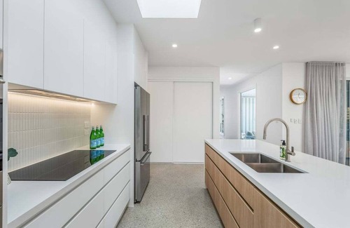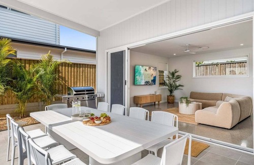 Inside, the home features light-filled open-plan living styled with a modern coastal touch. There are three separate living areas, providing plenty of room for everyone to spread out and enjoy. Two of these living spaces include king sofa beds, offering flexible options for additional guests. The lounge and dining areas flow seamlessly into a fully equipped kitchen, complete with high-end appliances, a NutriBullet, and everything you need to prepare meals at home. Large sliding doors open onto the outdoor spaces, inviting the sea breeze inside.