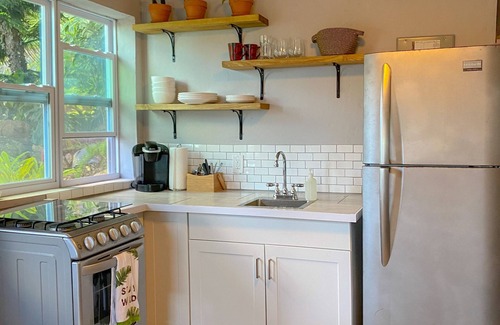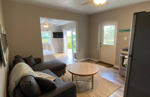 Palm Deck is located at the top of a quiet neighborhood with beautiful ocean views. You’ll have your own parking space just steps from the large private deck and front door that opens up to the newly remodeled open concept one bedroom apartment. There’s a kitchen with an oven, fridge, and Keurig coffee machine. The living room space has a couch that turns into a full sized bed and the bedroom has a queen bed and 40” TV that you can view from the couch as well. Relax on the large private deck surrounded by palms and look out at the ocean, or drive just a short 5 minutes to the nearest beach. This is the perfect apartment for a peaceful island get away.