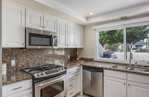 The main level includes a spacious living and dining area, a fully stocked kitchen and a bar area right off the living area. Watch your favorite shows on the 60" living room smart TV while sipping your favorite cocktail.