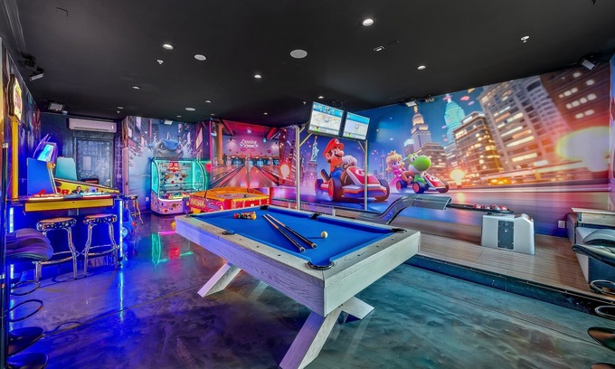 Luxury 8BR/6BA oasis sleeps 20, featuring a vast array of amenities including a huge pool & spa, pickleball court, basketball half court, playground, and more. Enjoy spacious living areas, fully equipped kitchen, whole home sound system (indoor/outdoor), and 65” smart TVs in every room. Outside, indulge in recreation with a private pool, playground, and sports courts. Book now for an unforgettable getaway!